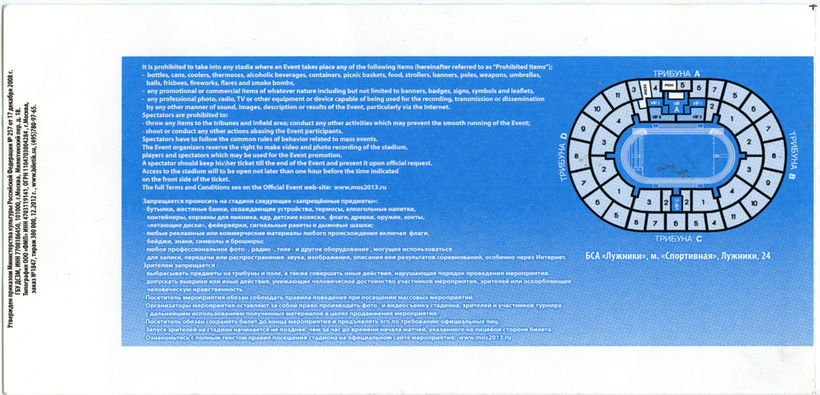Знак, магнит и входной билет чемпионата мира по лёгкой атлетике 2013 года в Москве подарены Современному музею спорта Чубуковым В.В.