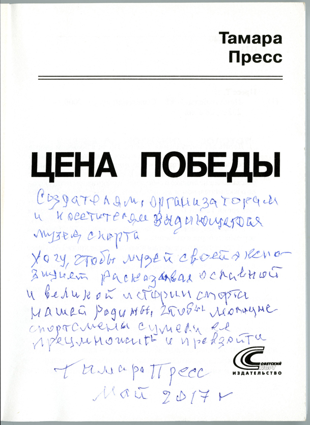 Книга Тамары Пресс «Цена победы» с автографом автора Современному музею спорта. Издательство «Советский спорт», Москва, 2009 год. В сборник вошли книга Т. Пресс «Цена победы», выпущенная в издательстве «Молодая гвардия» в 1977 году, более поздние воспоминания «Судьбой дарованные встречи» и несколько рассказов