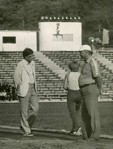 Соревнования «Старты Надежд». Слева – Юрий Анатольевич Шарапов, судья-стартёр соревнований, справа – В.А. Кобзев. Перед началом соревнований. Пионерский лагерь «Орлёнок». (1981)