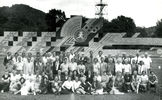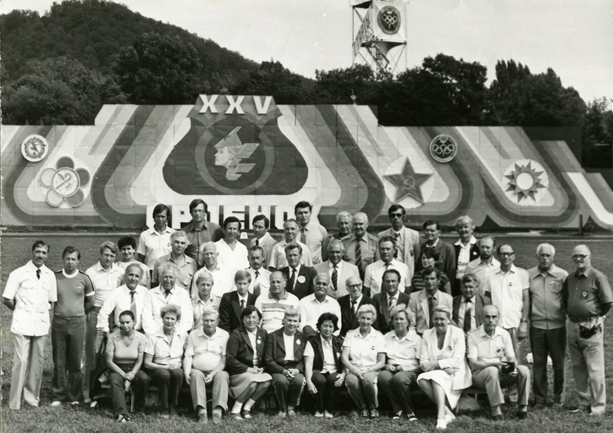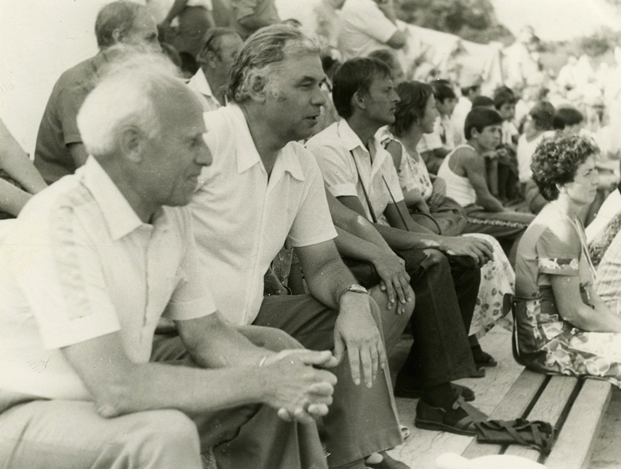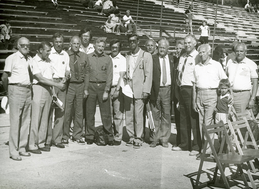 Финал чемпионата СССР по многоборью ГТО. Судейский корпус, завершение соревнований. Во втором ряду в центре лётчик-космонавт СССР, Герой Советского Союза, Председатель Всесоюзного Совета по работе ГТО, главный судья соревнований Алексей Архипович Леонов, слева от него – В.А. Кобзев. Ипподром города Тбилиси. (1977)