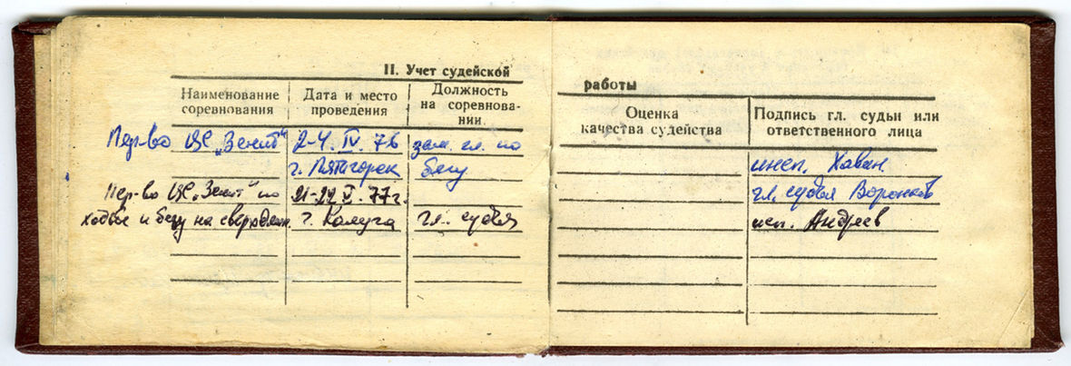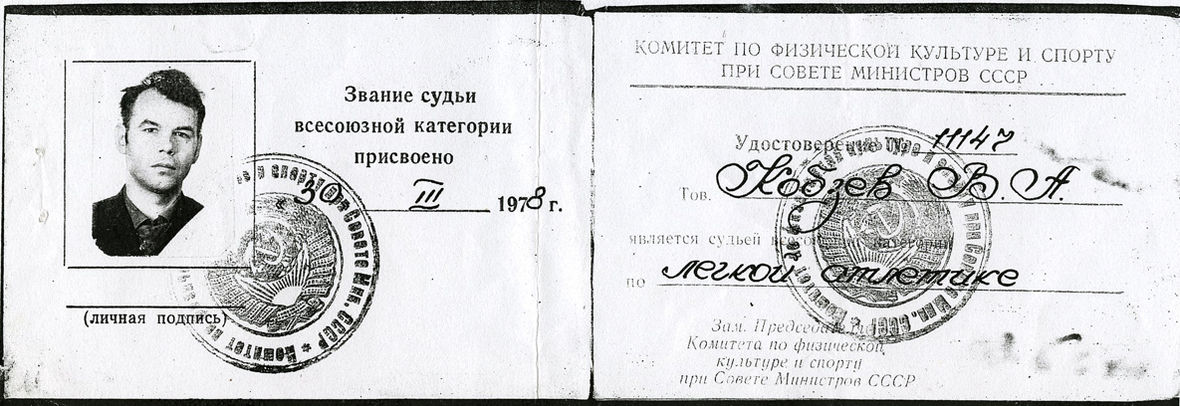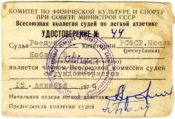 Удостоверение № 44 от 15 декабря 1970 года Комитета по физической культуре и спорту при Совете Министров СССР, Всесоюзной коллегии судей по лёгкой атлетике о том, что судья Республиканской категории РСФСР Кобзев В.А. является членом Всесоюзной комиссии судей секундометристов  Бланк регистрации прохождения испытаний и семинаров. 05.1971 – 07.02.85     Удостоверение № 1513 судьи по спорту Республиканской категории по лёгкой атлетике Кобзева В.А. Комитет по физической культуре и спорту при Совете Министров РСФСР. 21 октября 1971 года