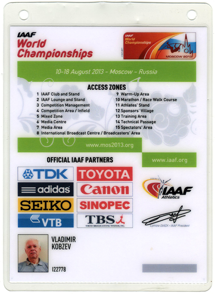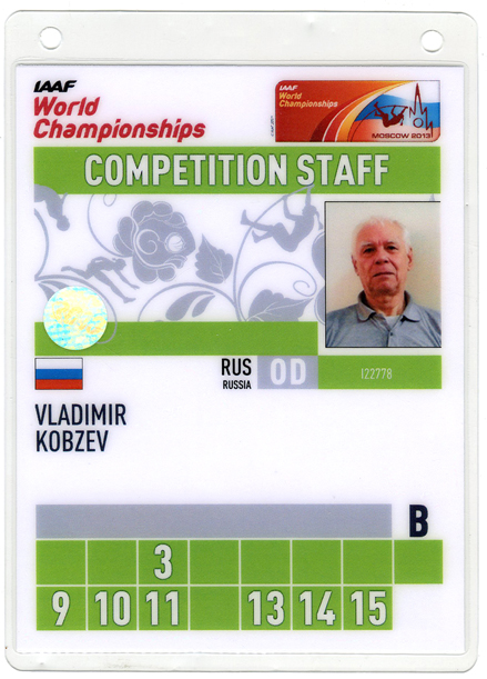 Карта аккредитации судьи чемпионата мира IAAF по лёгкой атлетике Владимира Кобзева. Москва (2013)  80-летний юбилей судьи Всесоюзной категории по лёгкой атлетике Владимира Арсентьевича Кобзева. С кубком от Современного музея спорта. 9 января 2017 года
