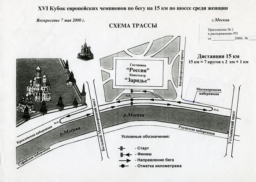 Владимир Кобзев осуществлял судейство XVI Кубка европейских чемпионов по бегу на 15 км по шоссе среди женщин. Схема трассы забега. Москва. (07.09.2000)