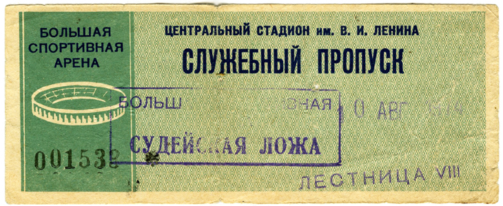 Служебный пропуск № 001533 в судейскую ложу Большой спортивной арены Центрального стадиона имени В.И. Ленина