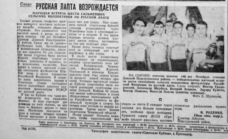 В сентябре 1957 г. в станице Динской Пластуновского района Краснодарского края состоялись первые в истории отечественного спорта официальные соревнования по русской лапте. Три дня длились этот интереснейший турнир, в котором приняли участие сельские спортсмены Балашовской, Чкаловской, Воронежской, Московской областей и Краснодарского края. Победителем матчевой встречи стала команда колхоза "40 лет Октября" Пластуновского района Краснодарского края.