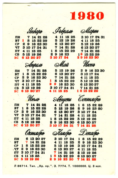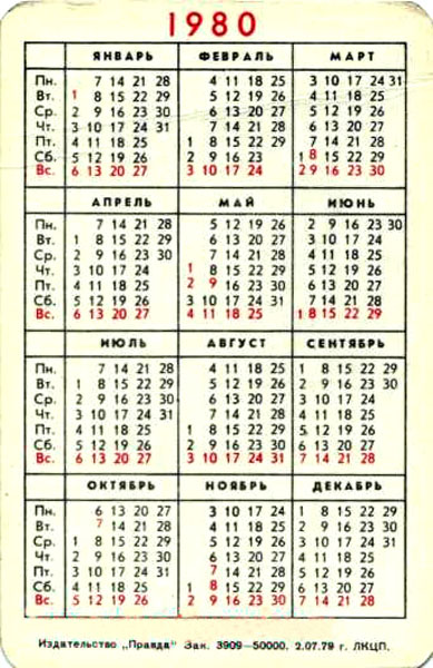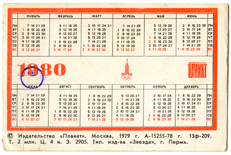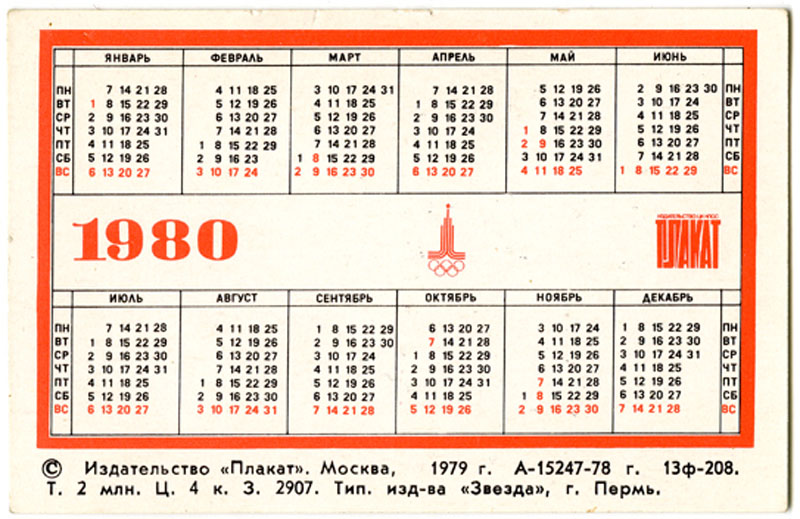 КАРМАННЫЕ КАЛЕНДАРИ С СИМВОЛИКОЙ ИГР 1980 ГОДА