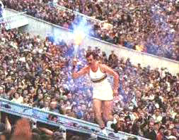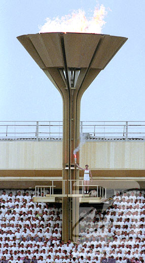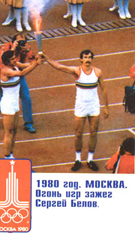 передаёт факел победителю Игр 1972 года Сергею Белову