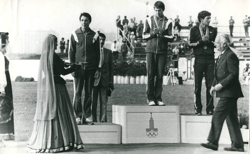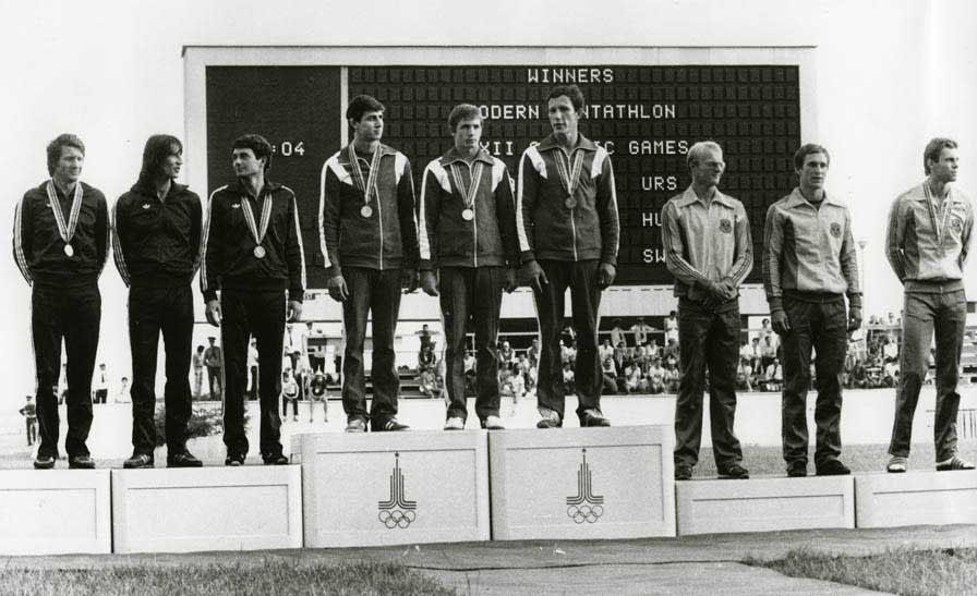 Сборная команда СССР по современному пятиборью – чемпион московской Олимпиады Слева направо: Евгений Липеев, Анатолий Старостин, Павел Леднёв