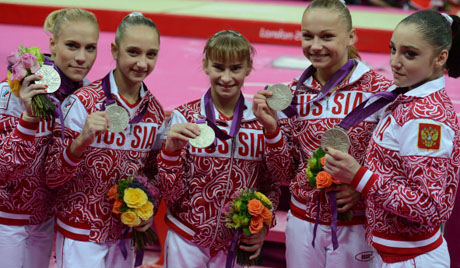 Ксения Афанасьева, Виктория Комова, Анастасия Гришина, Мария Пасека, Алия Мустафина Командное первенство (178.530) Серебряная медаль Фото: london2012.com