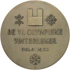 VI Олимпийские зимние игры 1952 года в Осло (Норвегия) 14 – 25 февраля В центре лицевой стороны медали расположен олимпийский факел на фоне греческой надписи «ОЛИМПИЯ», внизу – олимпийские кольца и девиз «Быстрее – выше – сильнее»; вверху по кругу надпись «Игры Олимпиад». На оборотной стороне схематический силуэт городской ратуши Осло, в центре – наименование, место и год проведения. Позолоченное серебро, серебро, бронза. Диаметр медали 70 мм . Эскиз лицевой стороны медали создал греческий художник В. Фалериус