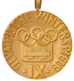 IV Олимпийские зимние игры 1936 года в Гармиш-Партенкирхене (Германия) 6 – 16 февраля На лицевой стороне медали изображена богиня победы Ника на колеснице с лавровым венком в руке, спортивный инвентарь, олицетворяющий зимние виды спорта, надпись «Гармиш-Партенкирхен». На оборотной стороне расположены олимпийские кольца, наименование Игр и год проведения. Диаметр медали 100 мм. Автор – художник, профессор Манфред Кляйн