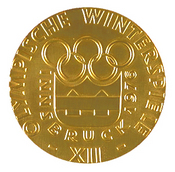 X Олимпийские зимние игры 1968 года в Гренобле (Франция) 6 – 18 февраля В центре лицевой стороны медали расположен герб города Гренобля, под ним – олимпийские кольца и надпись «Гренобль 1968», сверху по кругу надпись «X Олимпийские зимние игры». На оборотной стороне медали сквозь линии просматривается фигура спортсмена, олицетворяющего вид спорта, в котором выиграна медаль, внизу указано название этого вида спорта. Медаль оснащена держателем для ленты. Позолоченное серебро, серебро, бронза. Диаметр медали 60 мм