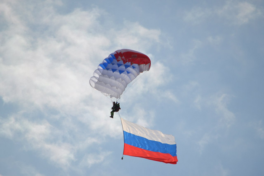 Выступление на параде Победы. Государственный флаг РФ буксирует Владимир Ильин. Чебоксары, 2015 год