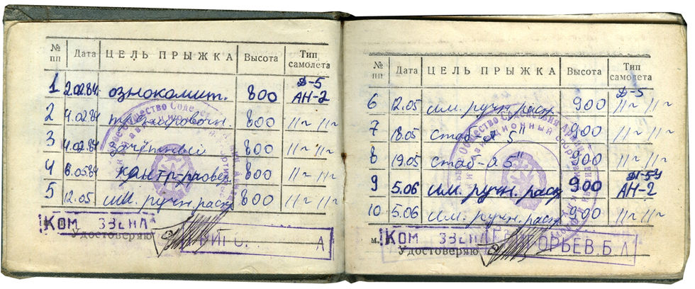 Награды, документы   Личная книжка учёта прыжков с парашютом Владимира Ильина с указанием первого прыжка, совершённого в день рождения – 2 февраля 1984 года