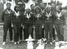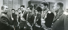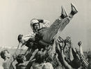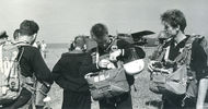 Чемпионат мира по парашютному спорту. Показательный прыжок на специально подготовленном парашюте. В составе сборной команды СССР Анатолий Осипов, Мая Костина и Алексей Ячменёв. Югославии, город Блед, 1970 год