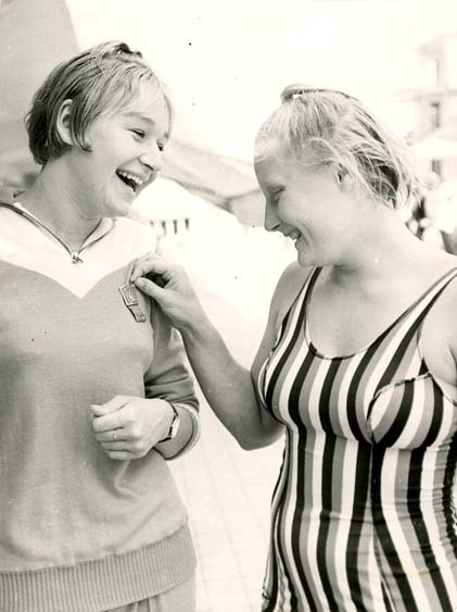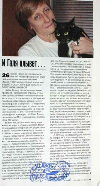 Фотографии Окончание школы. 16-летняя Галина Прозуменщикова. Родители Гали - участники Великой Отечественной войны. Отец - капитан первого ранга, подводник. Мама – медсестра С первым тренером Еленой Лукьяновной Алексеенко, 1963 год Заплыв предолимпийской недели в Токио 1963 года. На дистанции 200 метров Галина Прозуменщикова обходит нидерландскую пловчиху Клени Бимольт «Рекорды завоевывают школьники». Автор статьи - экс-рекордсмен мира по плаванию, легендарный советский пловец, «Король баттерфляя» послевоенной поры Семен Бойченко. Неизвестное издание. 1963 год Перед Олимпийскими играми в Токио. Севастополь. 1964 год «Золотая рыбка» - так называли 15-летнюю олимпийскую чемпионку Токио японские журналисты. На дистанции 200 м брассом Галина завоевала золотую олимпийскую медаль с новым олимпийским рекордом – 2.46.4 мин. Отныне эта черноморская девочка навсегда вошла в историю нашего спорта, как первая советская олимпийская чемпионка по плаванию Олимпийские игры 1964 года в Токио. После церемонии награждения победителей заплыва на дистанции 200 метров брассом: чемпионка Игр Галина Прозуменщикова и бронзовый призер Светлана Бабанина (СССР) Олимпийские игры 1964 года. В олимпийской деревне с прославленным Валерием Брумелем и Светланой Бабаниной Токио. С призером Игр на дистанции 200 метров брассом, членом советской сборной Георгием Прокопенко Токио. С призером Игр на дистанции 200 метров брассом, членом советской сборной Георгием Прокопенко Галина Прозуменщикова – победительница международных соревнований в Бремене. 1966 год Памятная открытка, выпущенная АПН к Олимпийским играм в Мексике 1968 года. Галина стала серебряным призером на дистанции 100 метров и бронзовым на двухсотке 1968 год. Тренировочная база в Цахкадзоре, Армения С 1970 года Галина Прозуменщикова тренировалась у Виталия Ивановича Сорокина, призера Олимпийских игр 1956 года в Мельбурне в эстафете 4х200 вольным стилем Матч СССР – США. Лужники Спартакиада народов СССР. С рекордсменкой мира Ириной Поздняковой Чемпионат Европы 1970 года в Барселоне (Испания). Галина стала двукратной чемпионкой на дистанциях 100 и 200 метров брассом. Еще одно европейское золото она завоевала в 1966 году в Утрехте (Нидерланды) на своей коронной дистанции 200 метров Матч СССР-Великобритания, Минск, 1971 год. Прозуменщикова – победительница на дистанции 200 метров брассом Чемпионат СССР 1972 года. Отбор на Игры в Мюнхене. Лужники На приеме у министра обороны СССР А.А. Гречко после Олимпийских игр в Мюнхене. 1972 год. Галина завоевала серебро на стометровке и бронзу на дистанции двести метров Галина Прозуменщикова – студентка факультета журналистики МГУ Cтудентки Галина Прозуменщикова и Наталья Кучинская (спортивная гимнастка) на стажировке в газете «Советский спорт». 1973 год Будущий тренер – Г.Н. Прозуменщикова Галина Николаевна Прозуменщикова с дочерью Ириной и сыном Гришей, 1986 год На встрече ветеранов ЦСКА. С гимнастками, олимпийскими чемпионками Ларисой Петрик и Ольгой Карасевой Прославленные ветераны спорта ЦСКА. На переднем плане: Галина Прозуменщикова и фигурист Александр Горелик В родном Севастополе. 2002 год Журнал «Огонек».Статья Валерия Чумакова «И Галя плывет…». 2003 год Чемпионат России 2004 года. Почетные гости: Елена Войцеховская, Геннадий Турецкий и Галина Прозуменщикова