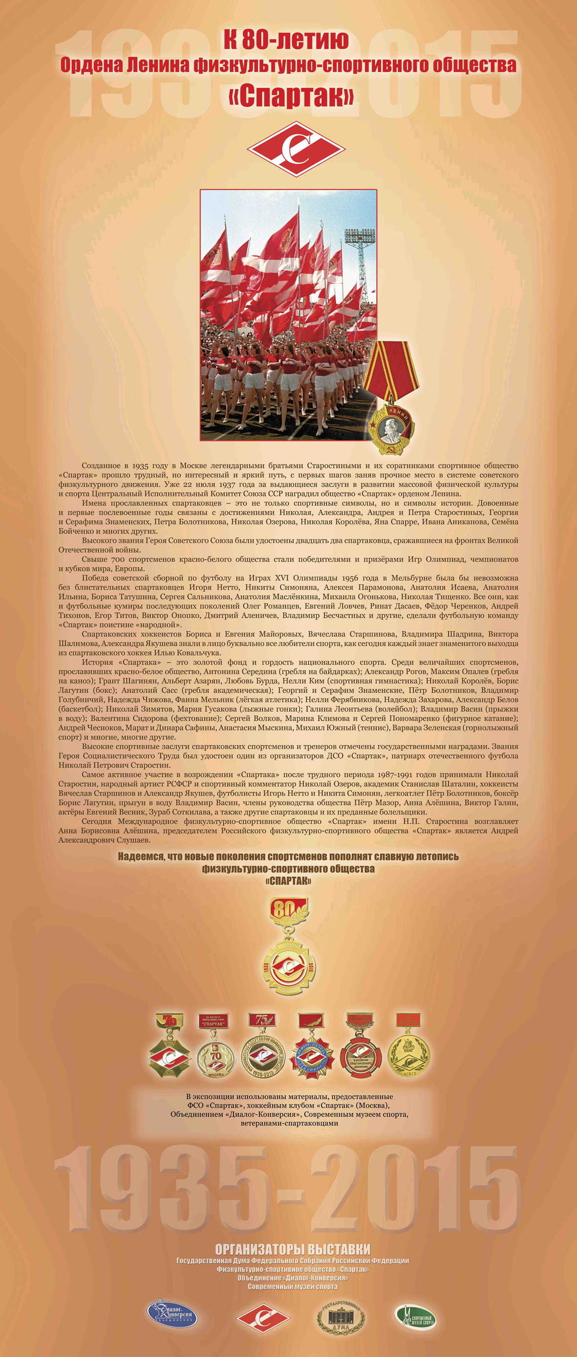 Созданное в 1935 году в Москве легендарными братьями Старостиными и их соратниками спортивное общество «Спартак» прошло трудный, но интересный и яркий путь, с первых шагов заняв прочное место в системе советского физкультурного движения. Уже 22 июля 1937 года за выдающиеся заслуги в развитии массовой физической культуры и спорта Центральный Исполнительный Комитет Союза ССР наградил общество «Спартак» орденом Ленина.