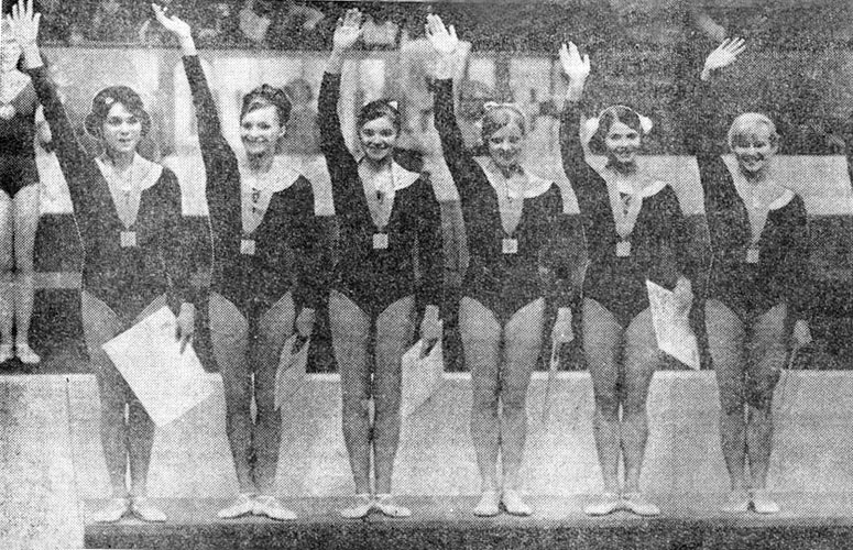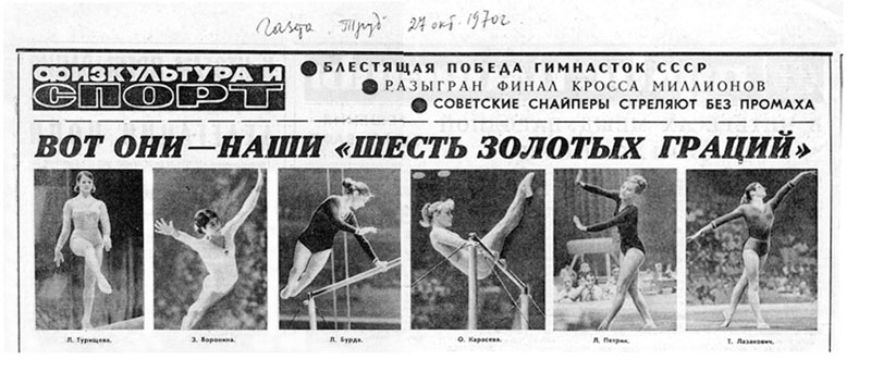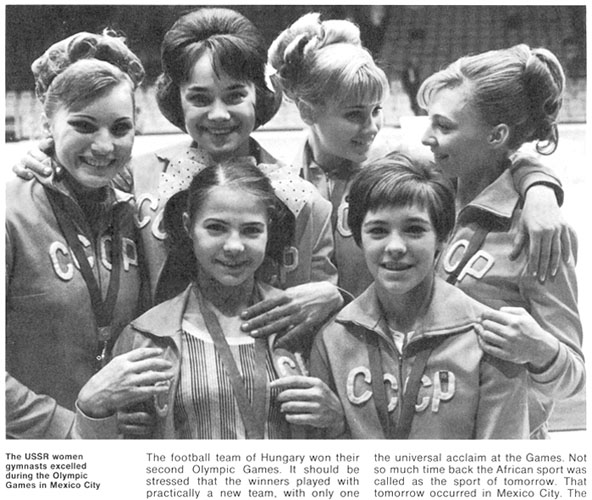Золотая олимпийская сборная СССР по спортивной гимнастике. Слева – направо в верхнем ряду: Лариса Петрик, Зинаида Воронина, Ольга Карасева, Наталья Кучинская. Внизу: Людмила Турищева и Любовь Бурда. Мехико, 1968 год