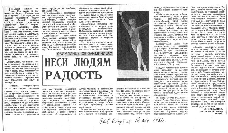 Статья Ольги Карасевой (псевдоним – Коваленко) в рубрике «Советского спорта» «Олимпийцы об олимпийцах», 1981 год