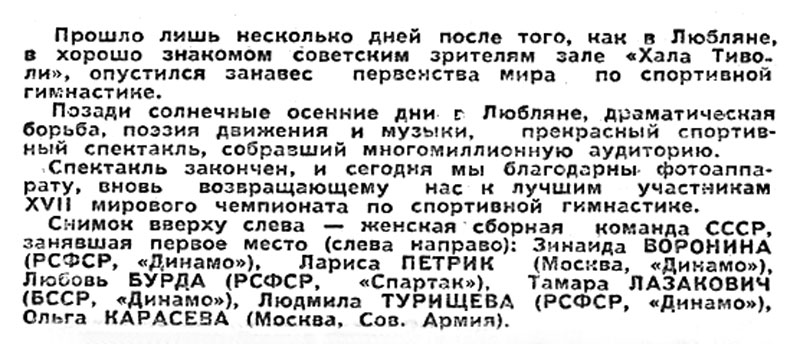 Ольга Карасева – чемпионка Европы 1969 года в вольных упражнениях, серебряный призер в многоборье и упражнениях на бревне, бронзовый – в опорном прыжке. Ландскруна (Швеция)