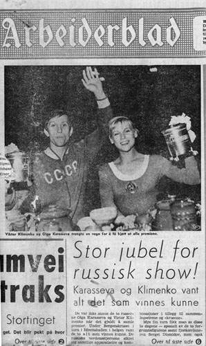 С Джил Шау С Виктором Клименко Ольга Карасева и Виктор Клименко – триумфаторы турнира 1970 года в норвежском Бергене. Фото из газеты «Bergens Arbeiderblad», 09.11.1970 года