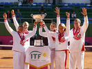 Российская сборная – триумфатор розыгрыша Кубка Федерации 2008 года: В. Звонарева, Е. Веснина, Е. Макарова, С. Кузнецова, капитан команды Ш. Тарпищев Фото fedcup.com