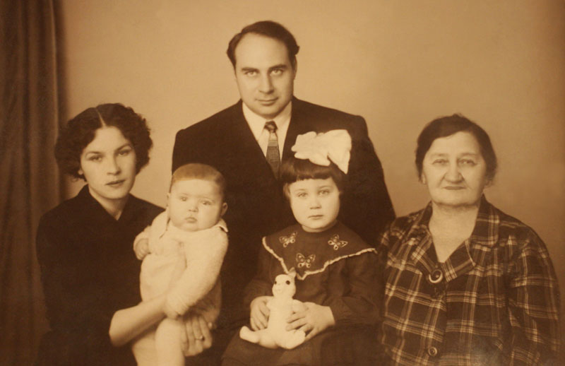 Районный центр Тетюши, где вырос Аркадий Воробьёв. В гостях у мамы. Слева направо: Аркадий Никитич, мама Просковья Александровна, супруга Эльвина Илларионовна, брат Борис и дочери Аркадия Никитича – Наталья и Алёна. 1958 год