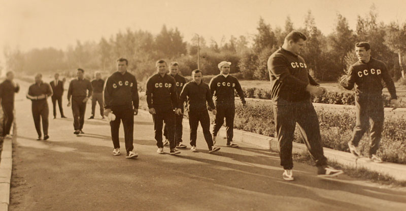 Сборная команда вышла на утреннюю зарядку: впереди справа Д. Шанидзе и Л. Жаботинский; далее Я. Тальтс, Е. Смирнов, Г. Четин, Б. Селицкий; за ними В. Беляев, А.Воробьёв (тренер), Я. Крыницки (тренер). Все атлеты имели звания чемпионов СССР, мира и часть – Олимпийских игр. Сборы в городе Дубне. 1968 год. (Комментарий Воробьёва А.Н.)