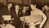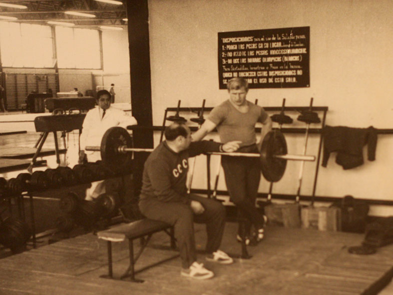 Президент МОК лорд Киланин знакомится с техническим оснащением кафедры тяжёлой атлетики Воробьёва – лучшей спортивной кафедры Советского Союза. ГЦОЛИФК, 1976 год. (Комментарий Воробьёва А.Н.)