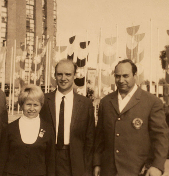 В жюри чемпионата мира по тяжёлой атлетике в Москве. В ложе Международной федерации тяжёлой атлетики с болгарским специалистом, доктором психологических наук Ф. Гековым и английским судьёй (слева)