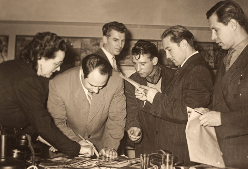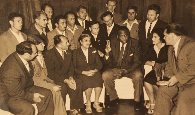 В гостях у американского певца Поля Робсона в Ялте. Первый слева сидит А. Воробьёв. 1955 год. (Комментарий Воробьёва А.Н.)