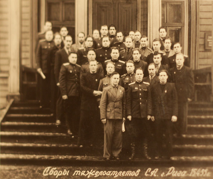 Город Тетюши, начало 1943 года, перед отправкой на фронт. Соседи-товарищи (слева направо): Иван Фролов, Аркадий Воробьёв, Анатолий Шатунов. (Комментарий Воробьёва А.Н.)