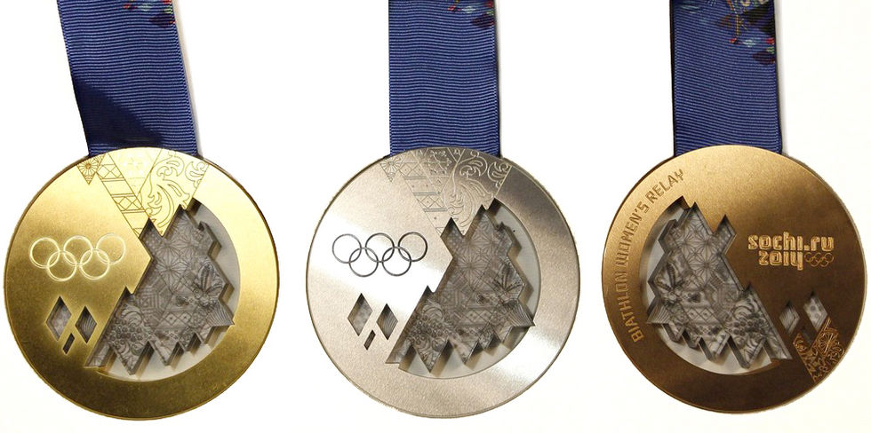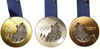На лицевой стороне наградной медали XXII Олимпийских зимних игр 2014 года изображены олимпийские кольца, на оборотной – название вида соревнований на английском языке и эмблема Игр. На ребре медали размещено официальное название соревнований на русском, английском и французском языках. Медали изготовлены из серебра и бронзы, медали высшего достоинства покрыты тонким слоем золота 999 пробы. Вставка из поликарбоната символизирует лёд и несёт фрагмент визуального образа Игр – лоскутного одеяла. Толщина медали 1 см, диаметр – 10 см, вес – 460 гр (бронза), 525 гр («золото», серебро). Всего изготовлено 1300 медалей, что является рекордом за всю историю проведения «Белых Олимпиад». Дизайн наградных медалей разрабатывался художниками Сергеем Царьковым, Александрой Федориной, Павлом Наседкиным и Сергеем Ефремовым. Изготовитель медалей компания «Адамас».