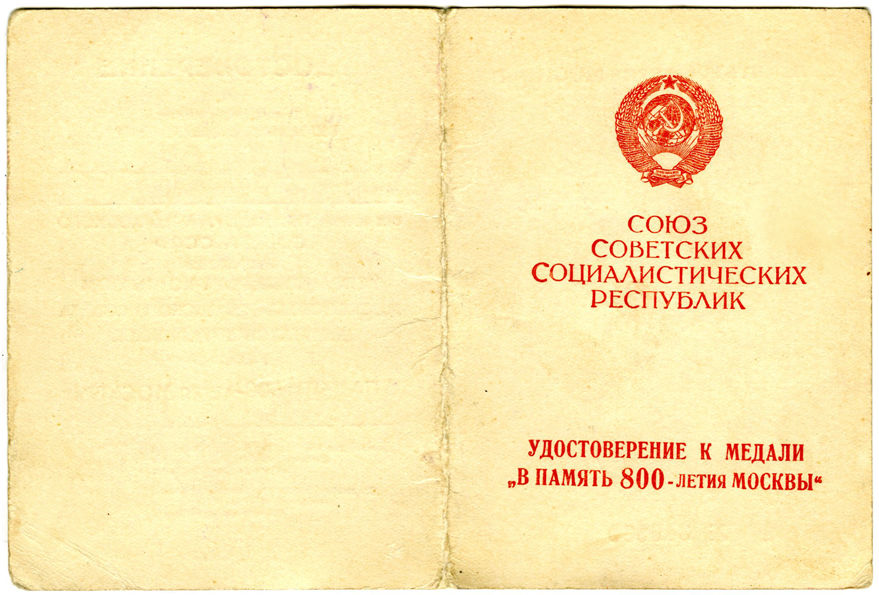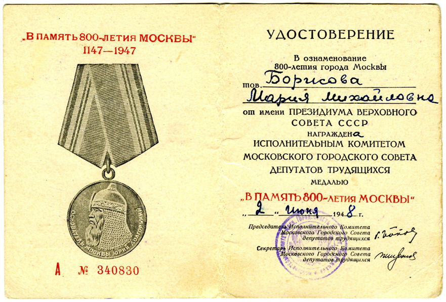 Удостоверение к медали «В память 800-летия Москвы» 2 июня 1948 года
