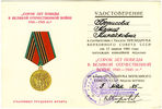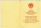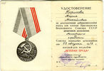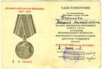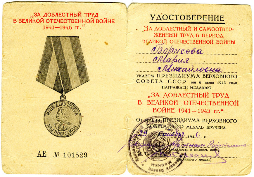 Удостоверение к медали «За доблестный труд в Великой Отечественной войне 1941 – 1945 гг.» 29 октября 1946 года