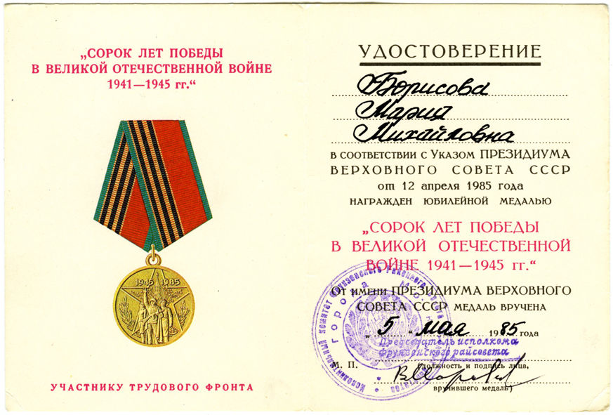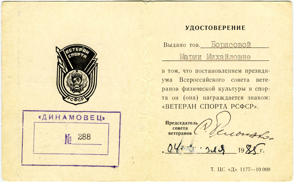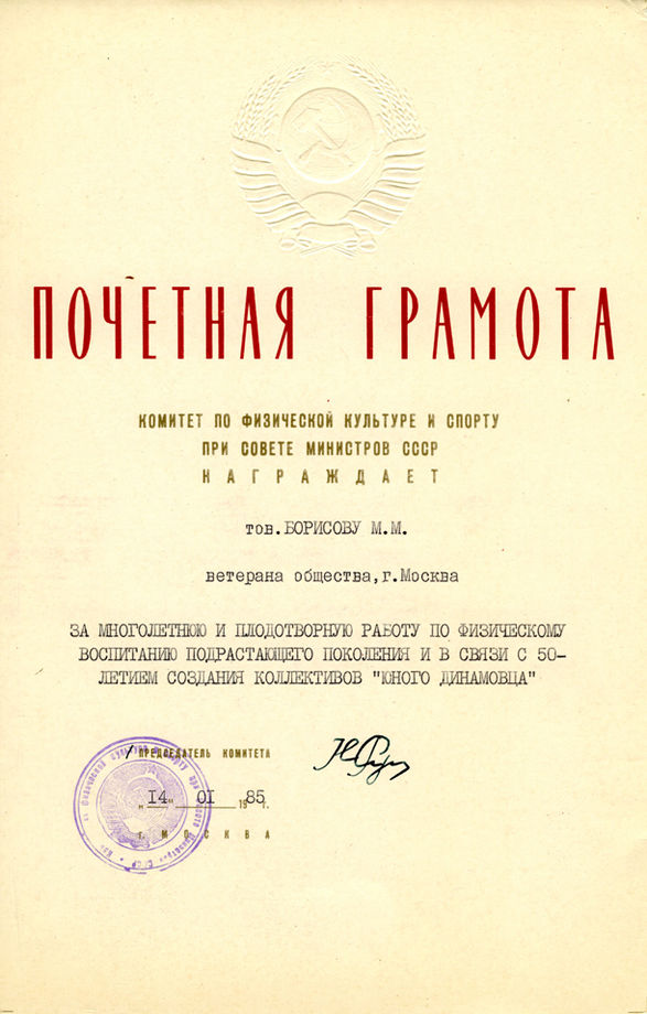 Почётная грамота Борисовой М.М. от Комитета по физической культуре и спорту при Совете Министров СССР за многолетнюю и плодотворную работу по физическому воспитанию подрастающего поколения и в связи с 50-летием создания коллективов «Юного Динамовца». 14 января 1985 года