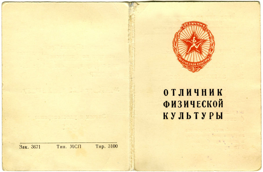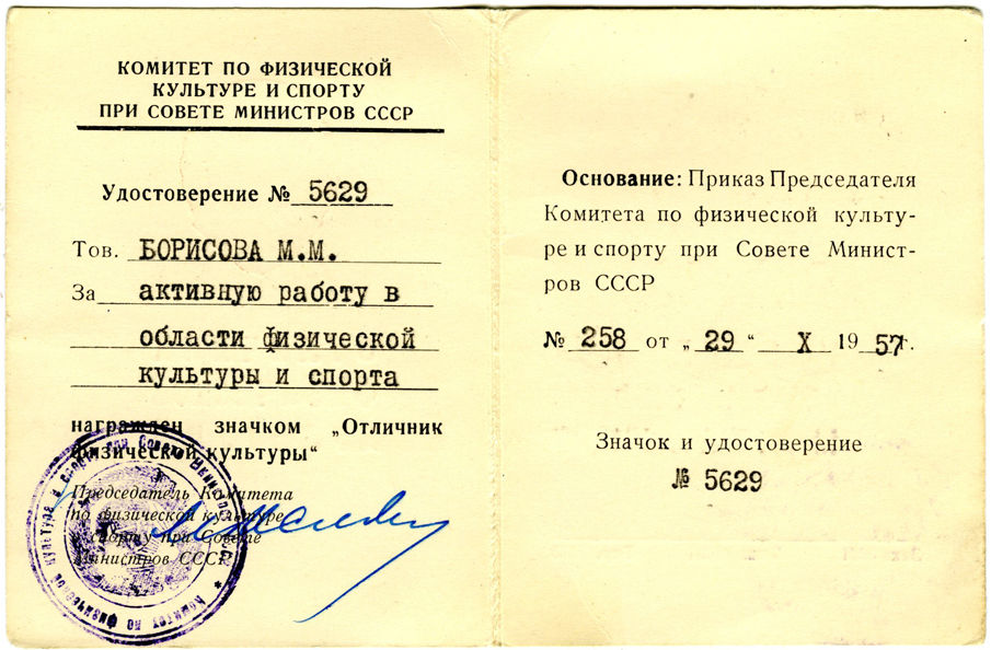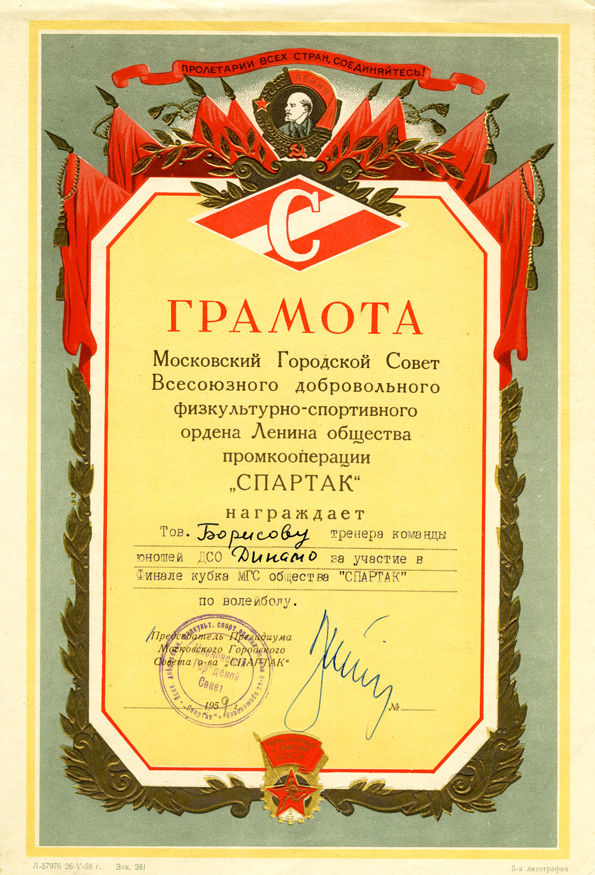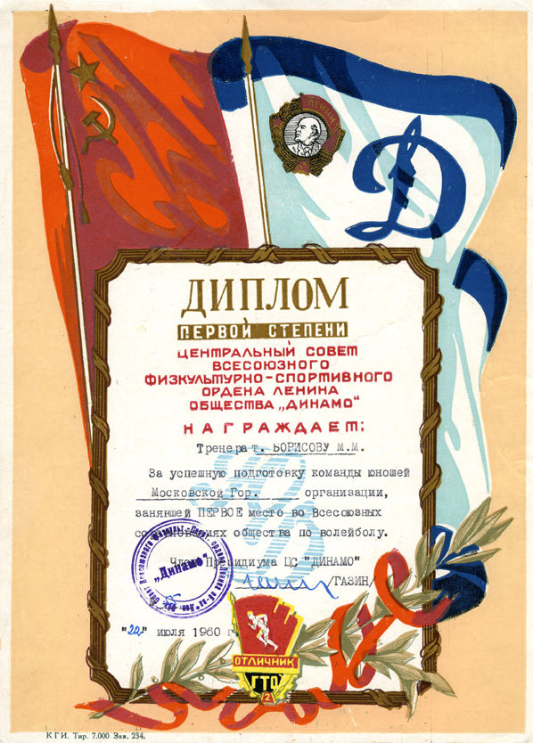 Диплом первой степени Борисовой М.М. от Центрального Совета Всесоюзного физкультурно-спортивного ордена Ленина общества «Динамо» за успешную подготовку команды юношей Московской городской организации, занявшей первое место во Всесоюзных соревнованиях общества по волейболу. 20 июля 1960 года