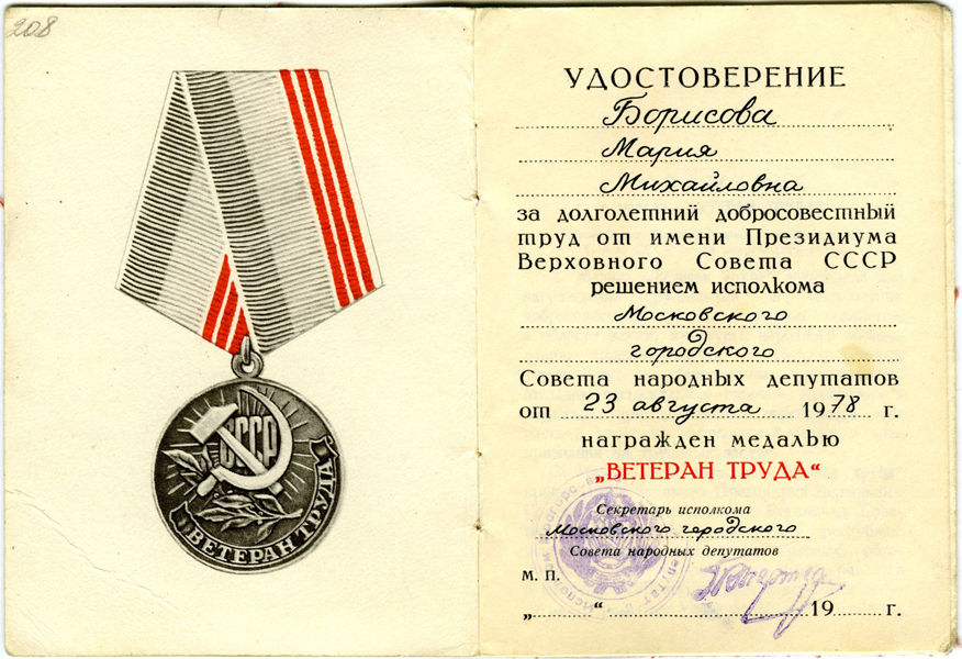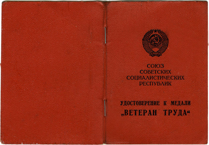 Медаль «Ветеран труда» и удостоверение к ней. 23 августа 1978 года