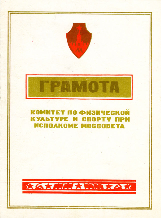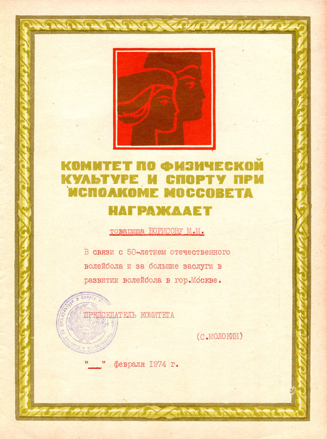 Грамота Борисовой М.М. от Комитета по физической культуре и спорту при Исполкоме Моссовета в связи с 50-летием отечественного волейбола и за большие заслуги в развитии волейбола в городе Москве. Февраль 1974 года