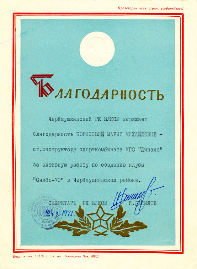 Благодарность Борисовой М.М. от Черёмушкинского РК ВЛКСМ за активную работу по созданию клуба «Самбо-70» в Черёмушкинском районе. 24 августа 1971 года