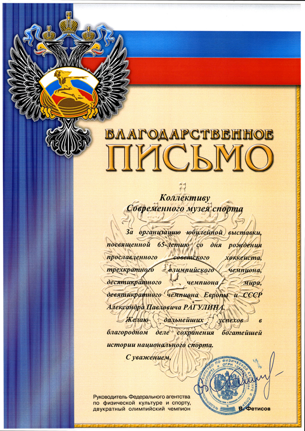 Благодарственное письмо коллективу cовременного музея спорта