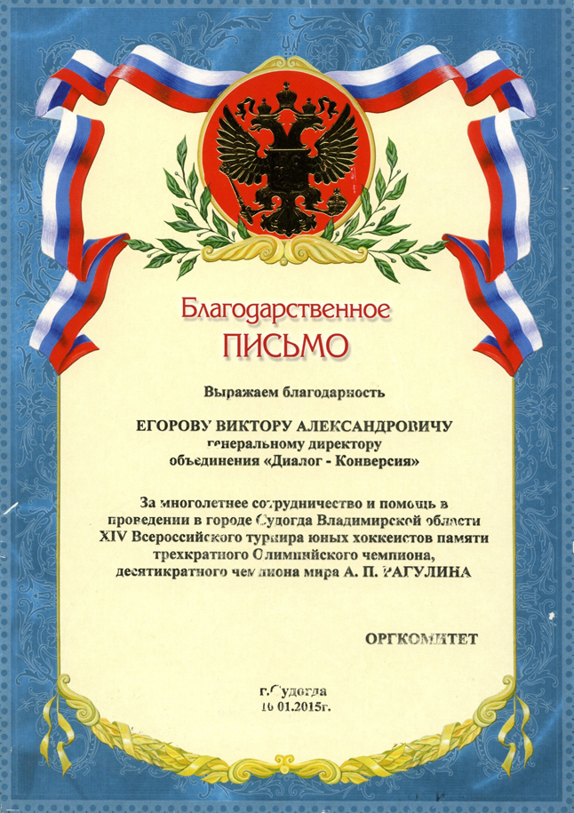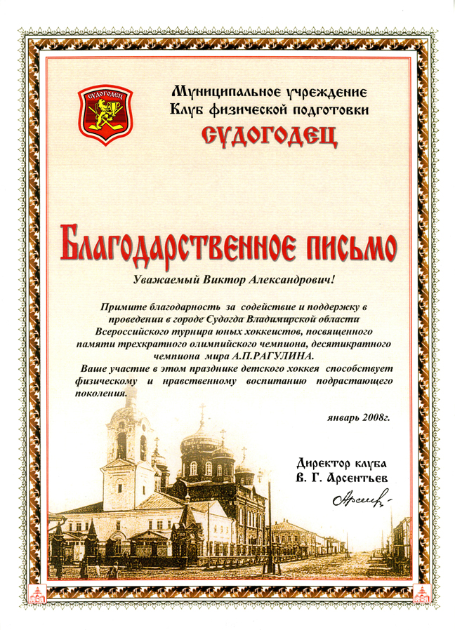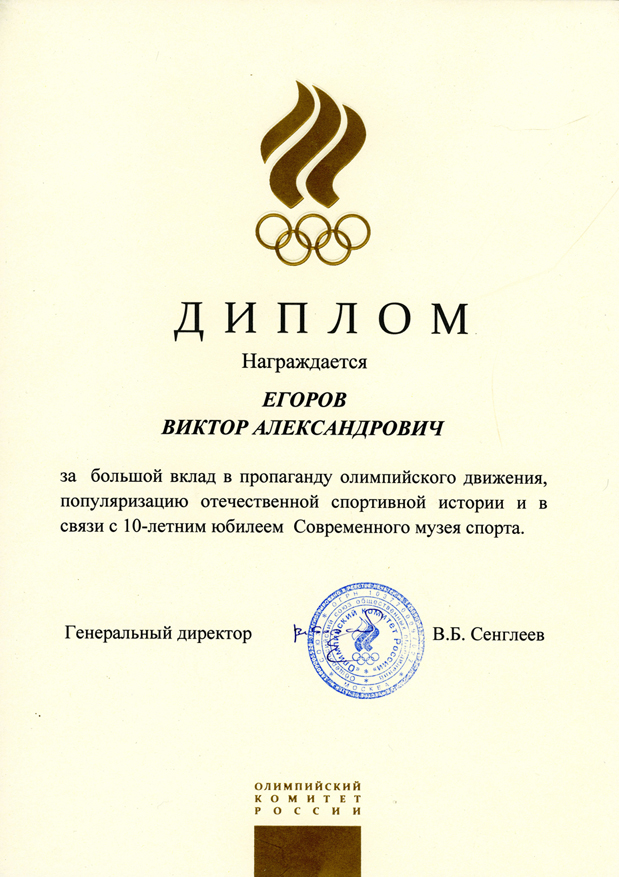 От души благодарю за огромный вклад в дело воспитания подрастающего поколения России на примере здорового образа жизни и достижений выдающихся советских и российских спортсменов, прославляющих нашу страну на чемпионатах мира, Европы и Олимпийских Играх.