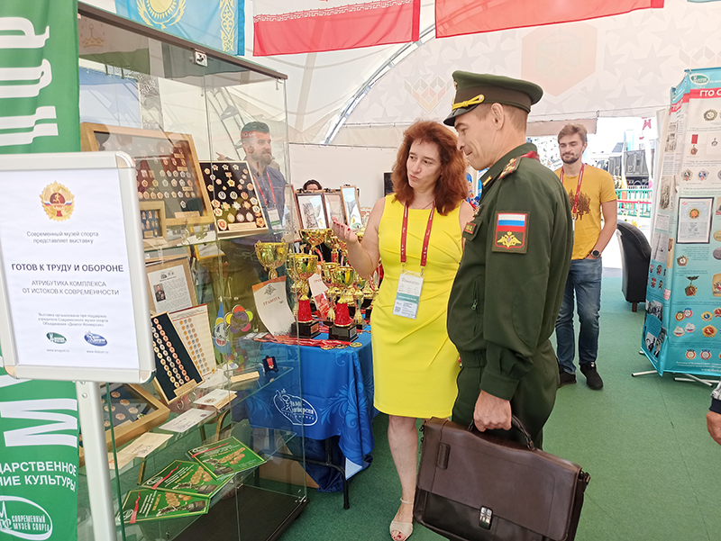 Генеральный директор Объединения «Диалог-Конверсия» Наталья Викторовна Муждабаева и Андрей Викторович Зыков, врио начальника Управление физической подготовки и спорта ВС РФ у экспозиции Современного музея спорта