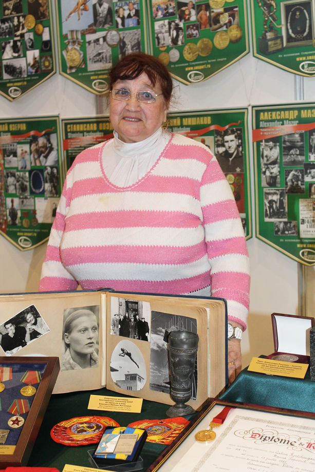 Алла Ивановна Жигалова у спортивных реликвий своих родных – знаменитых прыгунов в воду 50-60 годов прошлого века – Любови и Алексея Жигаловых.