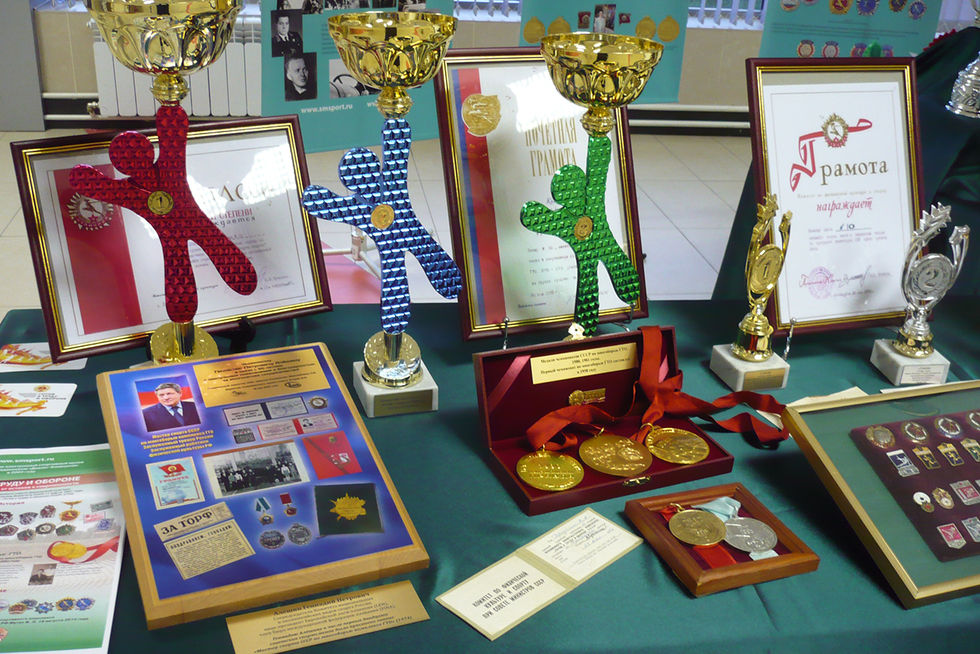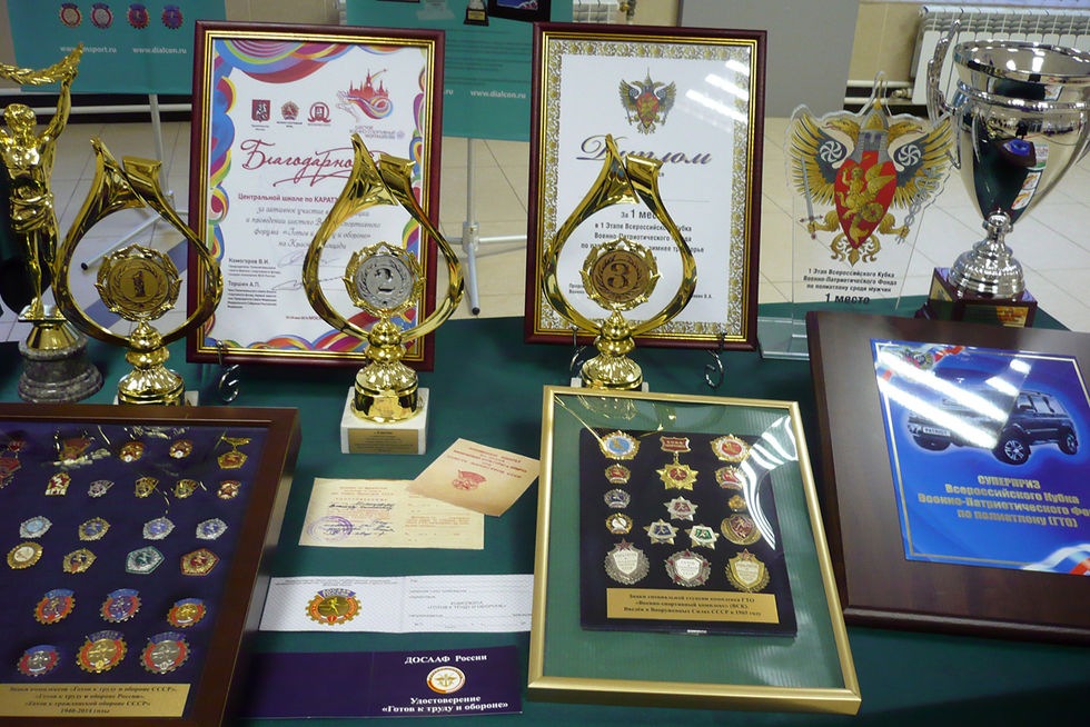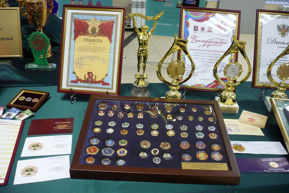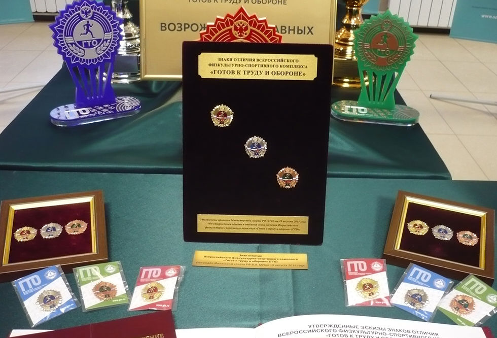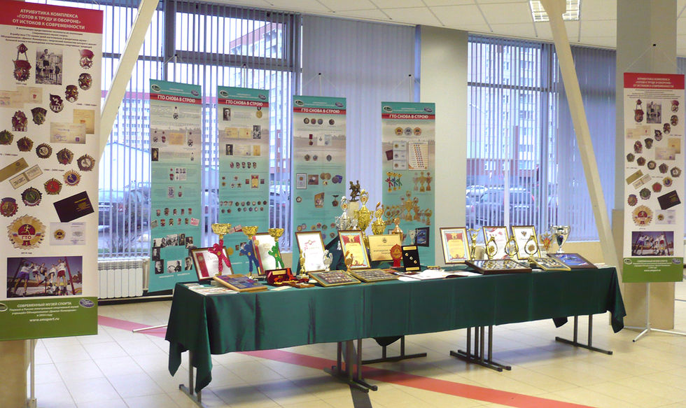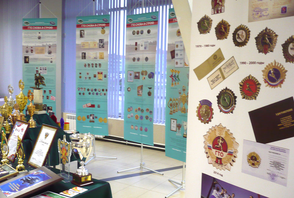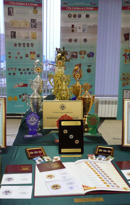 В экспозиции освещена история физкультурно-спортивного комплекса «Готов к труду и обороне» знаками комплекса, документами и современными изделиями Объединения «Диалог-Конверсия»