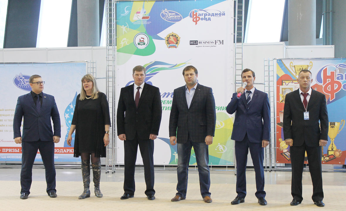 В церемонии открытия приняли участие Министр молодёжной политики и спорта Республики Башкортостан Андрей Иванович Иванюта (третий слева), руководитель Департамента внедрения комплекса «Готов к труду и обороне» Александр Андреевич Карпов (первый слева), заместитель генерального директора ООО «Диалог-Конверсия» Константин Юрьевич Волчинский (второй справа), директор ООО «Наградной фонд» (дилер Объединения) Игорь Вячеславович Горяев (первый справа), а также представители Торгово-промышленной палаты Республики Башкортостан и военно-спортивного фонда республики